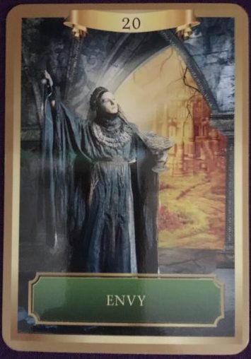 This card shows a woman holding a huge pearl in one hand and a platter of coins and pearls in the other. She stands in a silver room looking out at a golden city on the horizon. She has a life of value already, but she ignores that and longs for the shining prosperity she sees elsewhere. Instead of feeling happy and fulfilled, her desire for more only causes a deep sense of lack and dissatisfaction, and that energy shows in her dress. This card is telling you to let go of the jealousy and acknowledge the blessings you already have in your life. Now is the time to shift your focus. After all, when you envy others, it only attracts more to them – not you. Notice all that you have, and thank the Universe for it. Now is the time to move from a consciousness of lack to one of value. With this shift, all things change.