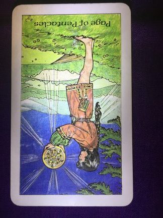 The Page of Pentacles reversed can tell you that you are feeling a little rebellious this week. Like that bad boy/girl ‘rebel without a cause’ type person. You want to do something different, just because you can. You want to fly in the face of convention, let your hair down, be wild and free. Fight for the sake of fighting and argue for the sake of winning, whether the subject is important to you or not. You are feeling a little dangerous this week, tired of being the good boy/girl or someone elses’s doormat. This is all fine and good… to a point. But if you take this attitude too far, you may find it could cost you more than you bargained for. If you are spouting off at work, it could get you a reprimand in your personnel file or even worse… you could get demoted or have your pay docked or even find yourself without a job at all! Or on the other hand, you may be feeling scattered and lack luster, with a serious lack of motivation. You may find that you have no enthusiasm for your work or assignments. If you are a student, you may be playing more than studying and find when that big test or presentation rolls around, you aren’t prepared at all and bomb the whole thing. Pentacles are all about manifesting your goals and dreams, as well as day-to-day work and survival issues. And Pages are about new beginnings, fresh starts, and focusing on there given suits. Pentacles are the earth and physical plane suit. They deal with everyday living concerns. Money, finances, work, building, manifesting and surviving. The Pages also deal with news. So the Page of Pentacles deals with news about all things earthly and physical dealing with your everyday survival issues. Since this Page of Pentacles is reversed, it can indicate bad or delays in news concerning the earth or your physical everyday concerns such as bad news about money, school, or even your or someone else’s physical well-being. It can mean you are having trouble concentrating or carrying out your day-to-day tasks or dropping the ball on some important project you have been working on or money or news about finances or health issues isn’t good or will be delayed. This card is telling you it’s ok to voice your wild and carefree side, but do it in a respectful manner in order to protect your best interests. It’s ok to play, but balance it outwith some hard work too. Be mindful that you may be feeling unmotivated and scattered this week, so try to at least get a minimum done to keep yourself out of the doghouse. Nurture yourself and give yourself some space and time dedicated just for yourself in order to get through this week unscathed. The key to allowing yourself some freedom without suffering any lasting consequences is BALANCE! Be wild and crazy in your free time, not when you should be getting your work done. In health matters, give yourself some downtime… even take a day off just to rest up if you need it, but be ready to put in some extra effort when you return to make up for it. In finances, don’t make any major decisions this week… it can wait till things settle down next week. If your check is late, hang in there… it will be there next week. Let your rebellious nature have some free time and expression, but do it after work… you’ll be better off for it come Monday!