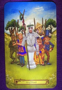 The Six of Wands is celebrating about our achievements. Something you’ve been working on for possibly a long time has finally culminated in success. You are thrilled, and everyone is thrilled FOR you. Finally you have overcome all those obstacles that were standing in your way, blocking your progress. Perhaps there is an award or public recognition of some kind associated with this achievement. This card also speaks of how important other peoples opinions are to you. You want everyone to like and approve of you. So much so that you may go so far as to change yourself for them, or do things you normally wouldn’t do in order to gain their approval. Be careful that you don’t compromise your own values or authentic Self just to ‘people please.’ Also, chances are you didn’t achieve this accomplishment by yourself. Be sure to give others who helped you achieve this position the credit they are due. Celebrating, giving recognition where it’s due and cheering each other on is something everyone could use. It reassures us we are appreciated and moving in the right direction. Take time to celebrate your success, but realize, with sixes, we are little more than half way through our journey. We have more tasks ahead of us to conquer before we reach the culmination of the ten.