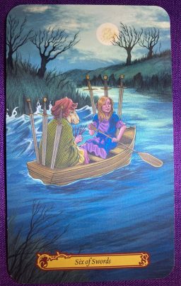 Since this is a Six, we are leaving those troubles but haven’t yet arrived at our destination (which would be shown as a Ten card). But we are in a safe space now because we have left oppression behind. We have escaped that which oppresses us and are on our way towards better times. Whew!!!