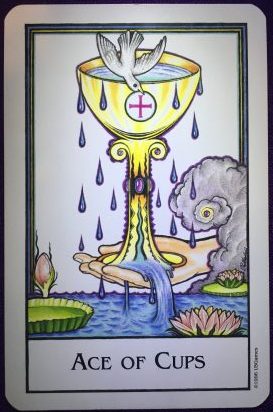 The symbolism in the card shows literally, a cup so full of water (water symbolizes the emotions, usually of love, joy, peace and contentment) that it can’t be contained and is running over the brim and spilling from it’s base. The cup itself is made of precious gold, indicating the vessel that holds all the precious emotions. Above the cup is a dove which symbolizes peace and love and in it’s beak is a wafer of bread (bread symbolizes nourishment and in this case, that which nourishes our spirit and emotions comes from Spirit) with the sign of the cross which indicates the nourishment, peace and love comes from above, from spirit/God/the Universe/ Source. Also, adorning the cup and encircling the stem, or that which supports us, are a group of the purple (the color of spirit and the color of Authority and Virtue) crystal Amethyst, which symbolizes the 7th Energy Chakra which is our connection to spirit. The hand coming out of the cloud offering us this overflowing cup of goodness comes from a source which is there, yet unseen… this is a symbolism of the importance of our faith and in knowing that we are cared for and nourished by spirit. We can also see the lotus blossoms that indicates the peace that comes from having faith in spirit. Everything is watered and fed by the emotions which in turn makes the flowers grow and the lily pads lush and fertile. There is one unopened blossom which indicates the promise and potential of a new beginning or birth.