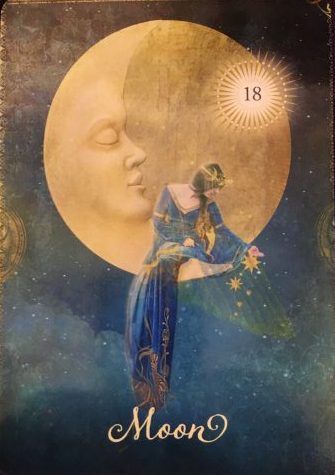 THE MOON is the card of the Psychic, the Gypsy, the Fortune-teller. It is the card of the mysterious Goddess of the night. The animus and primal in us, the beast or baser instincts within us all. It is also the card of the powerful feminine energy. The cycles in us and the Earth. Mother Nature’s cycles, menstrual cycles, gestational cycles, seasonal cycles, the cycles of the MOON herself, the tide cycles, as well as rites of passage cycles such as aging… the Maiden, the Mother and the Crone. THE MOON is the sacred feminine. THE MOON is the mysterious female. THE MOON is woman. On the next full Moon, look at her with your eyes and heart wide open. See her. Really see HER in all her beauty! Her face is full, her lips lush and sensual, her cheeks high and proud and strong. When you aren’t afraid to truly look at her, you can see THE MOON is NOT ‘The Man in the Moon’ at all; but your sacred feminine whom illuminates what lies in the darkest corners of our souls, asking us to see it, recognize it and accept it, and not be afraid!!! She is soft, she is nurturing, she is tranquil, serene and as soothing as a lullaby.