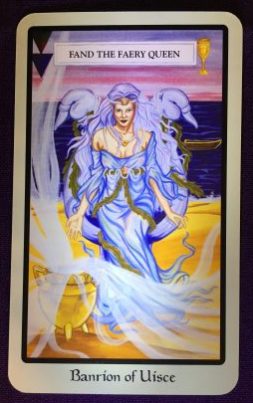 This week’s card is Banrion of Uisce, also known as The Queen of Hearts as well as the Queen of Cups,  because she presides over the realm of the emotions & psychic plane. She is the nurturer, the comforter, beauty itself, mysterious, intuitive, soul dweller, the seer, the knower, the feminine… Maiden, Wife, Mother. She ‘knows’ & sees into the very depths of our souls without any physical ‘proof’ … this is called Gnosis. She Rules the outer world by using her feelings and intuition rather than logic, facts and figures. She leads  and makes decisions with her heart, not her head. She is mysterious and you may never really be able to know or access all faucets of her. So this week, the Banrion of Uisce is asking you to go within yourself… spend some quiet time by yourself. Meditate. Spend some time soul searching and don’t be afraid to really FEEL. Use your feelings and instincts this week to make decisions or assess situations and people. The Banrion of Uisce is telling you to follow your heart. Use your senses. Feel, see, hear with your heart.  Use your intuition and gut reactions this week in order to ‘feel’   your way forward on your journey through life. She asks you to open your heart.  To accept the abundance readily available to us all by being open to receiving as well as giving  love. Seeing her this week is also a cue that it is time to nurture  and Mother yourself. Don’t give so much of yourself away to others that you have nothing left for or of yourself. You can’t give of yourself if you have nothing left to give.